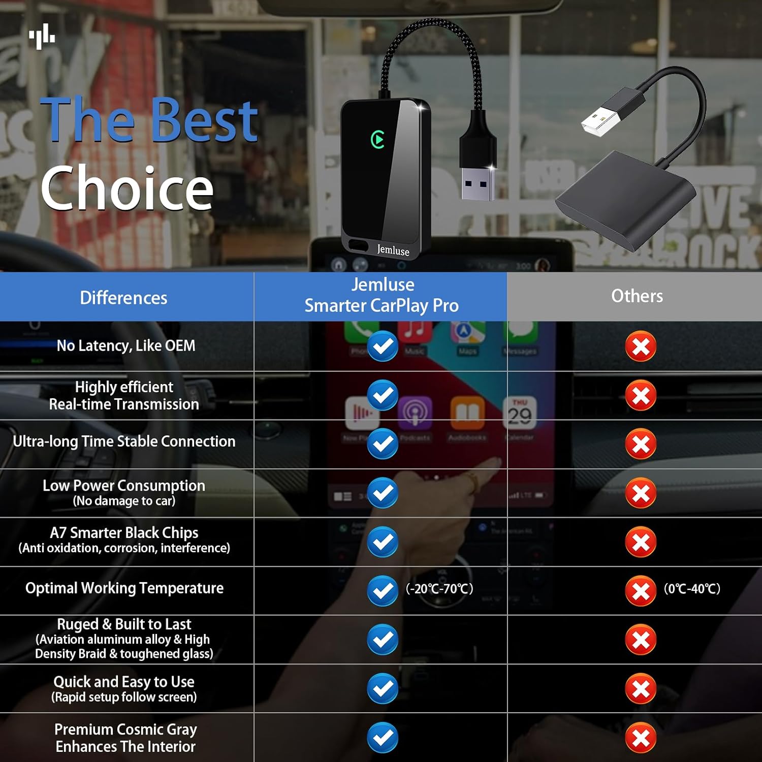 - 【Uncompromisingly 7A Microchip Tech】-Help You Focus on Driving- With 5.8 GHZ WiFi, 5.3 Bluetooth and 8-core processor for CarPlay genius makes transmission rate by up 40%, you can 10X faster than other car play take google maps, media, and messaging apps to car display. Unique black 7A chip keeps excellent performance in Anti-Oxidant, hardness, corrosion, and Temperature tests (-20°C to 70°C). No worry about disconnect during a long driving