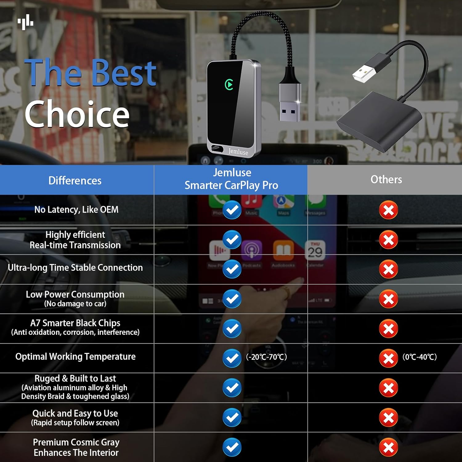 - 【Uncompromisingly 7A Microchip Tech】-Help You Focus on Driving- With 5.8 GHZ WiFi, 5.3 Bluetooth and 8-core processor for CarPlay genius makes transmission rate by up 40%, you can 10X faster than other car play take google maps, media, and messaging apps to car display. Unique black 7A chip keeps excellent performance in Anti-Oxidant, hardness, corrosion, and Temperature tests (-20°C to 70°C). No worry about disconnect during a long driving